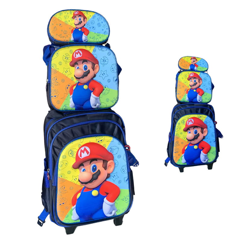 Porque el Kit Super Mario 3D combina una mochila carrito resistente, lunchera térmica y cartuchera en un conjunto escolar completo, coordinado y con el diseño icónico de Super Mario. Disponible en variedad de diseños, es la opción perfecta para el regreso a clases de todo fanático del videojuego. ¡Contactanos para más información sobre diseños y precios!